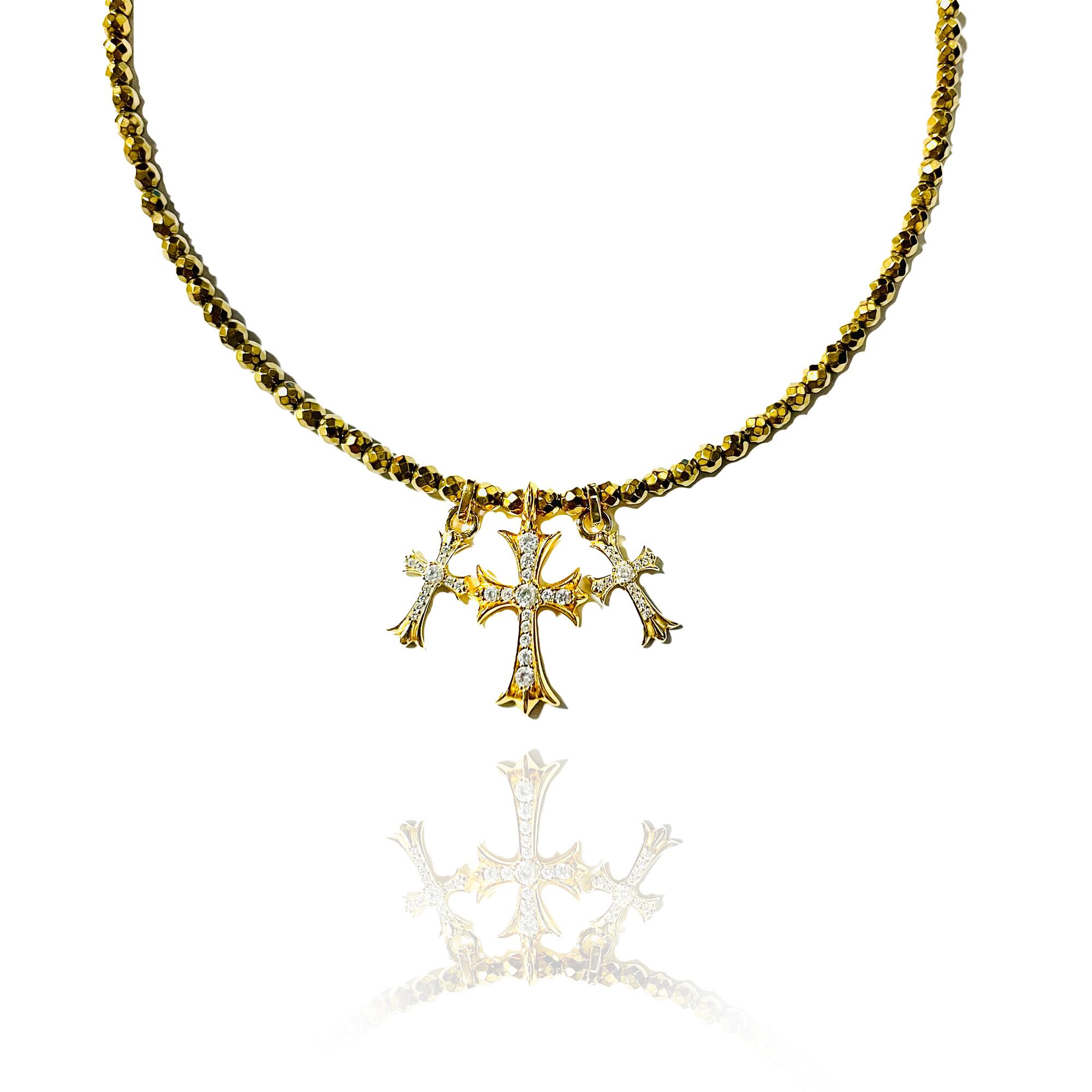 silver925のクロストップを3連で合わせたnecklaceです☆ヘマタイトは鉱石のため劣化する事なく半永久、長くご愛用いただけて肩こり改善、体調バランスを整える健康アイテムとして知られています
