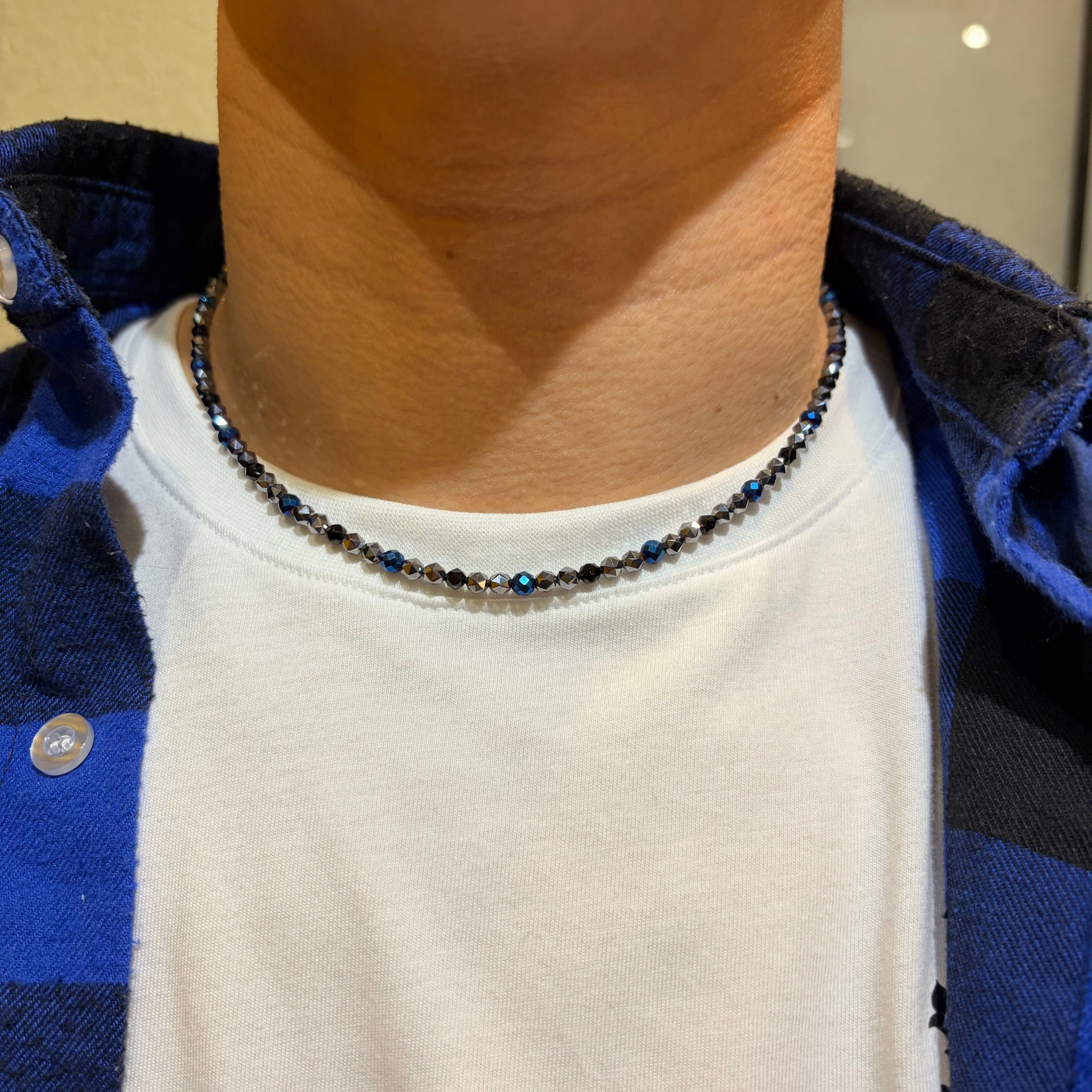 テラヘルツ鉱石主体のヘマタイトブルー(石)&ブラックスピネル(漆黒石)をアクセントにデザインされた3種の輝きを放つオリジナルネックレスです
