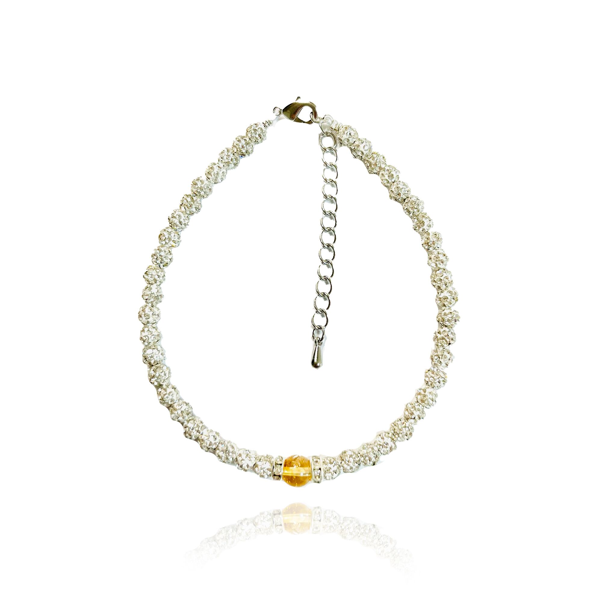 キラキラと輝くホワイトアンクレットに11月誕生石シトリン(財運、商売繁盛の願い)を添えました。上品な輝きを放つアクセサリーとしてはもちろん、意味や願いがこもったお守りとしてもお楽しみいただけます