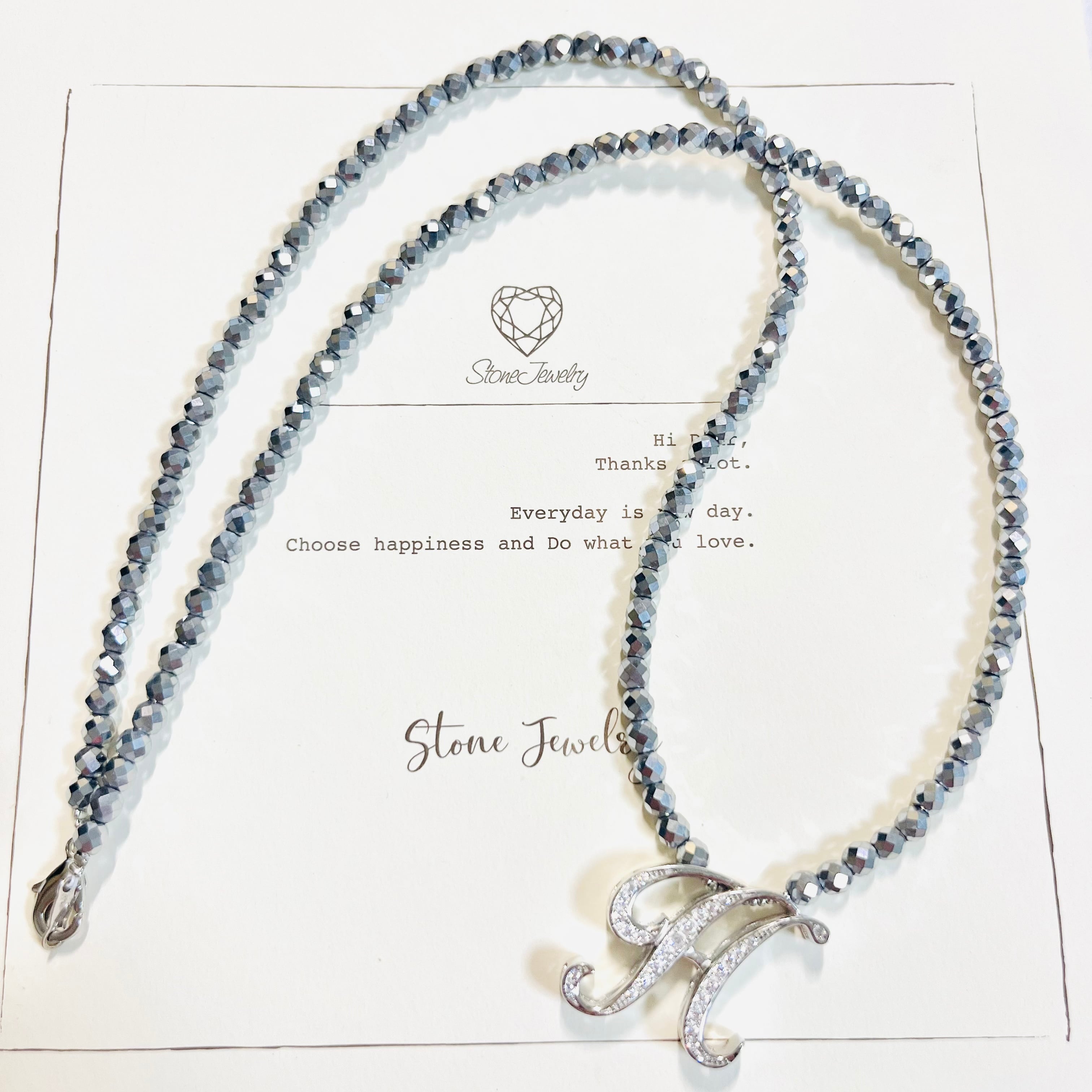silver925のイニシャルトップを合わせたnecklaceです☆ヘマタイトは鉱石のため劣化する事なく半永久、長くご愛用いただけて肩こり改善、体調バランスを整える健康アイテムとして知られています