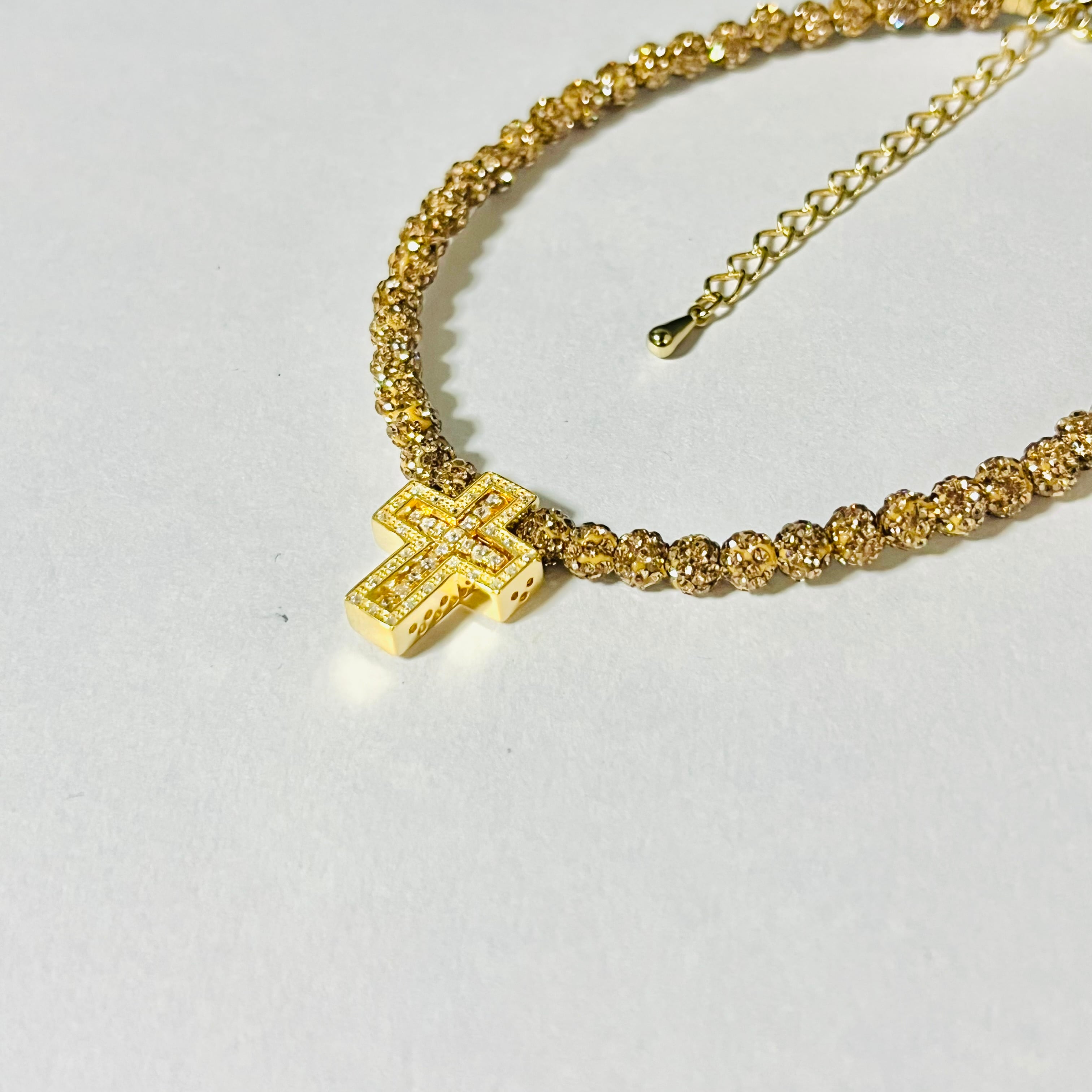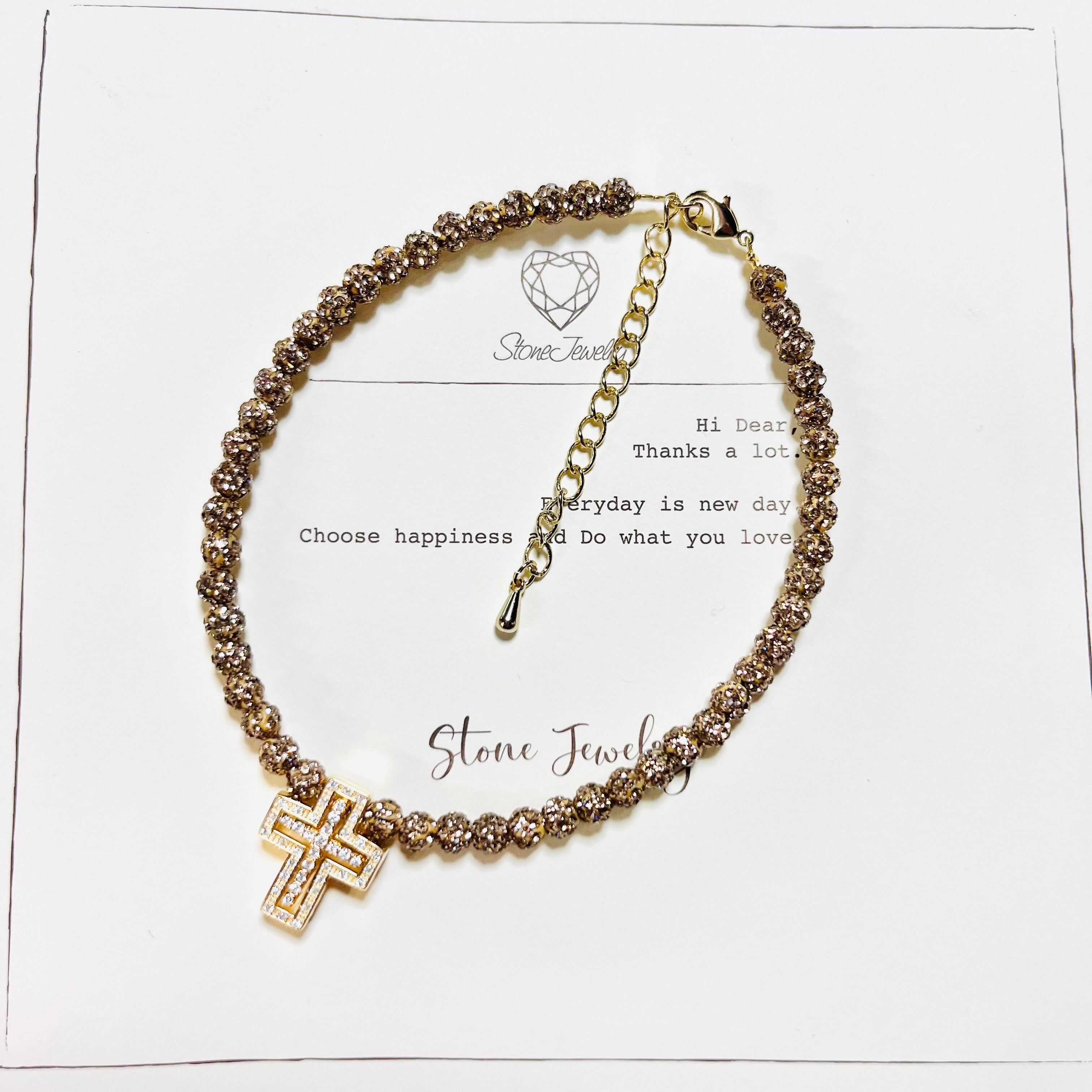 小さいダブルクロスをクリスタルガラスのホワイトチェーンと合わせたキラキラアンクレットになり、お風呂、温泉、海等も着けていただけます。足首にちょこっとついたダブルクロスが可愛く輝いております☆