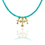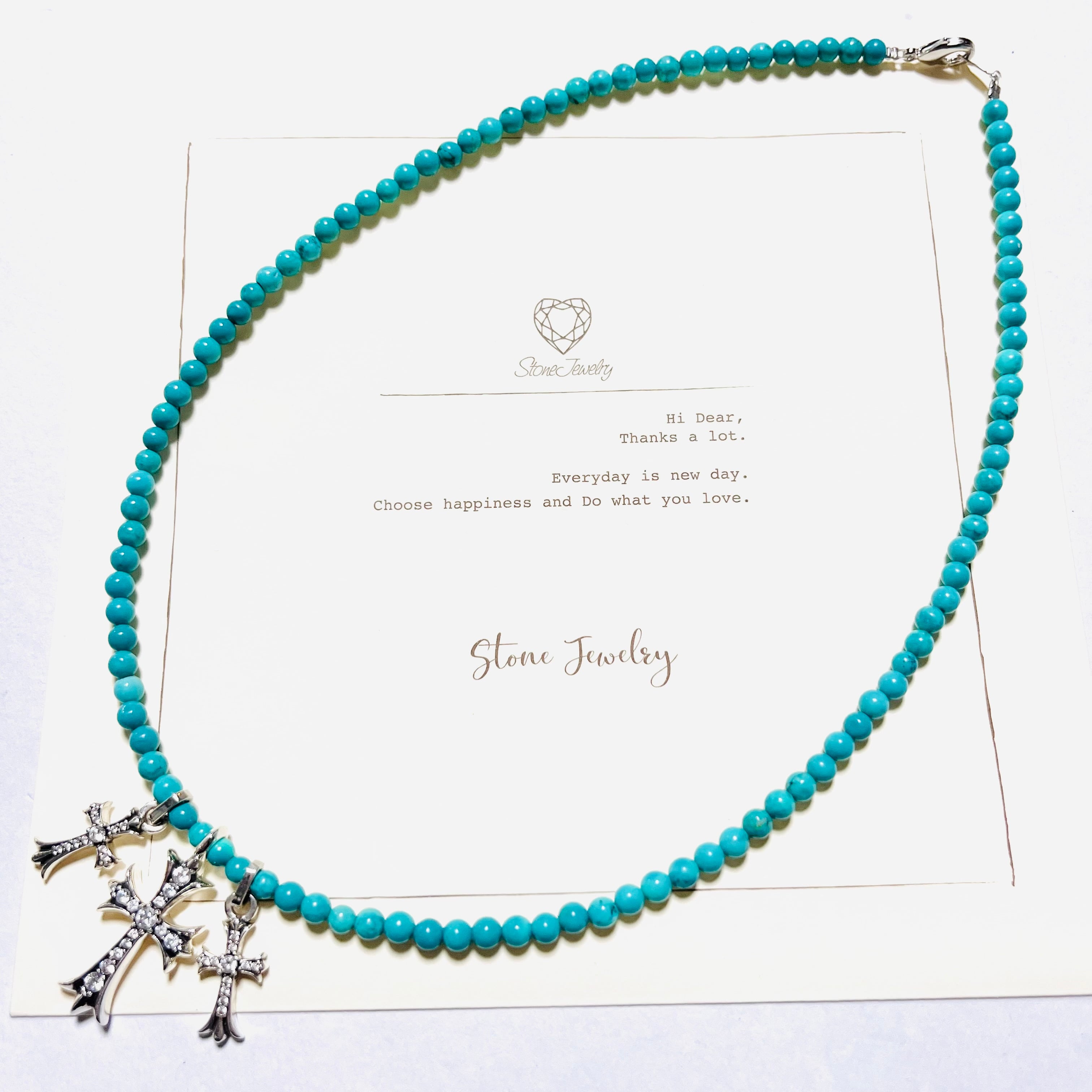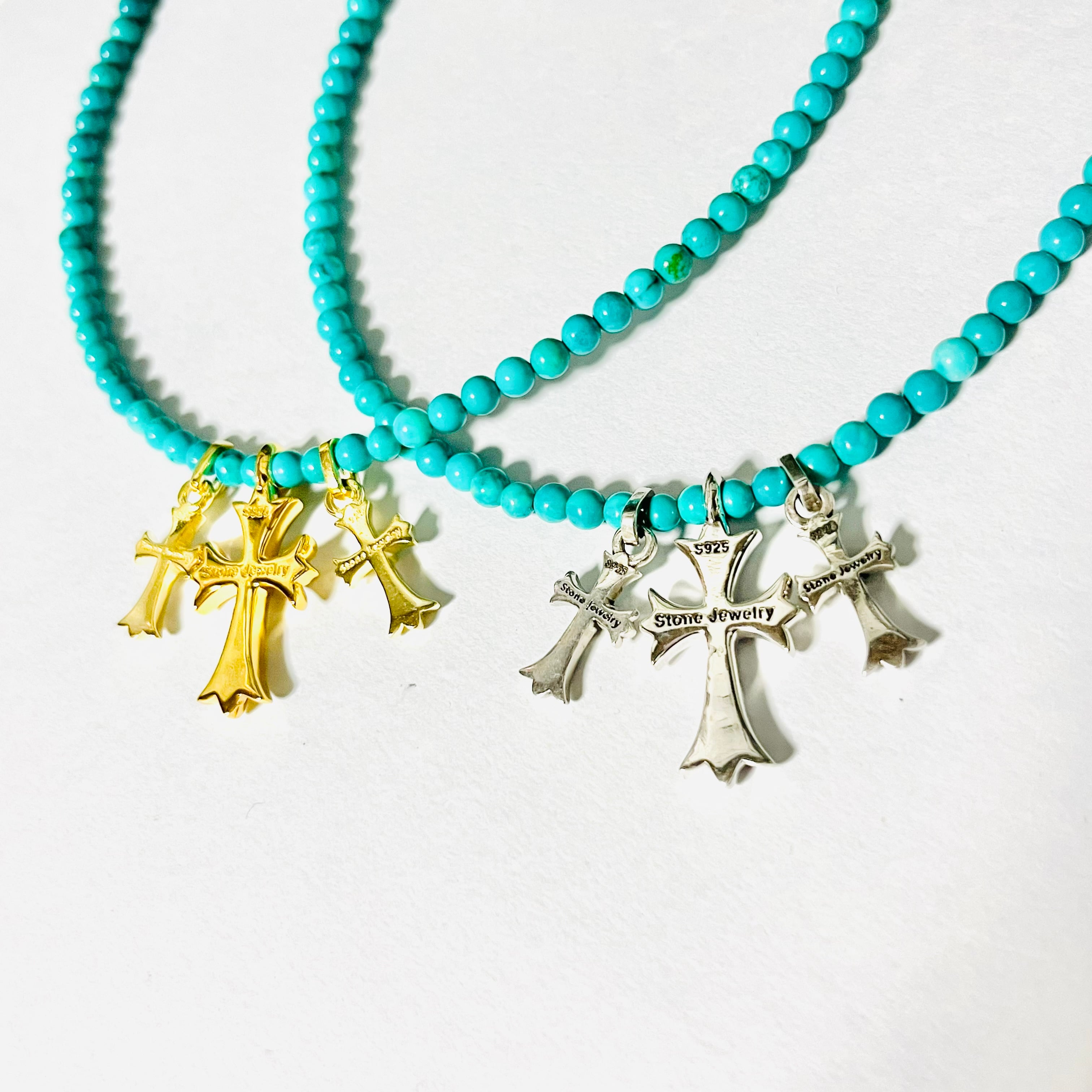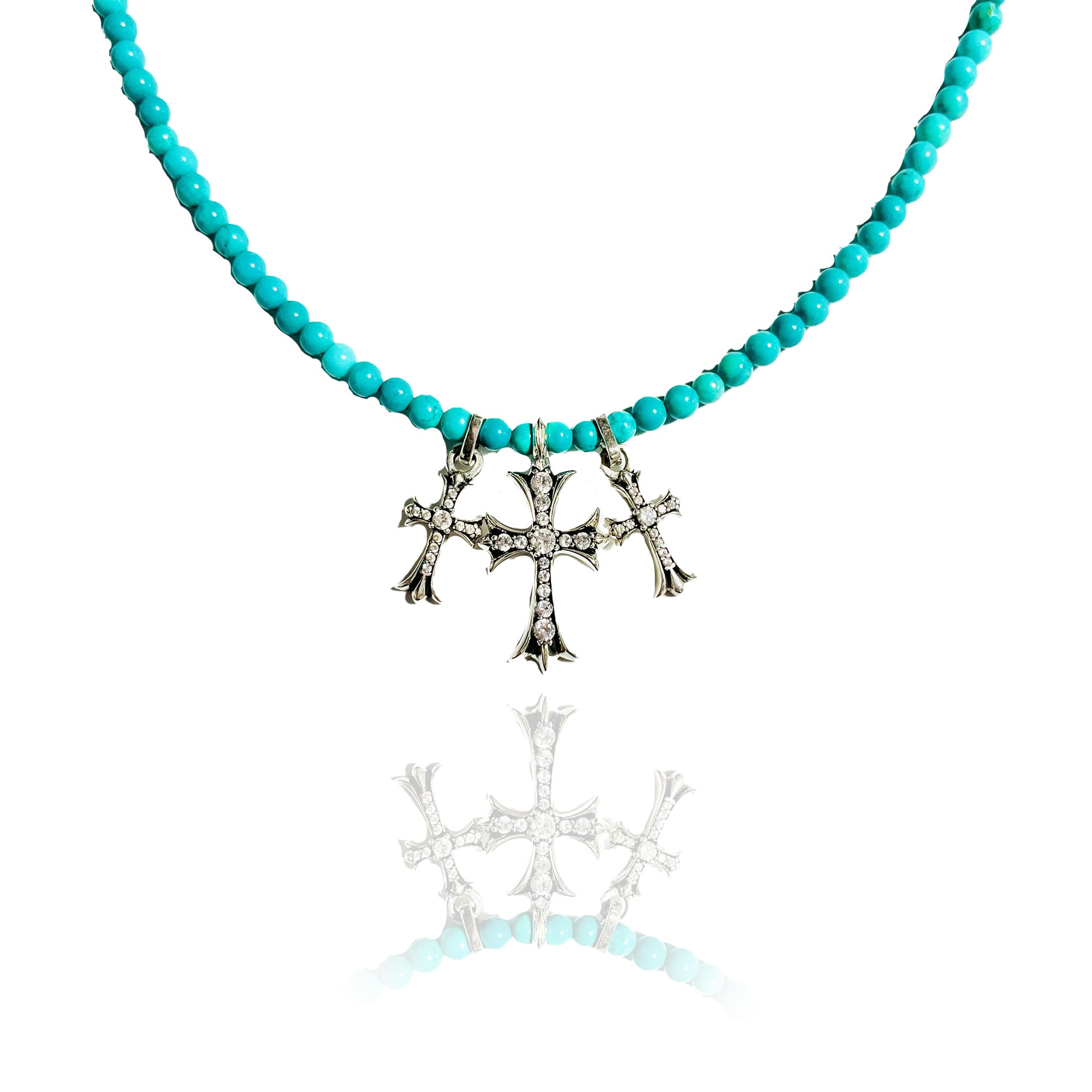 天然ターコイズにsilver925クロスを3連合わせたネックレスでお風呂や海等も着けていただけて長くご愛用できる素材です