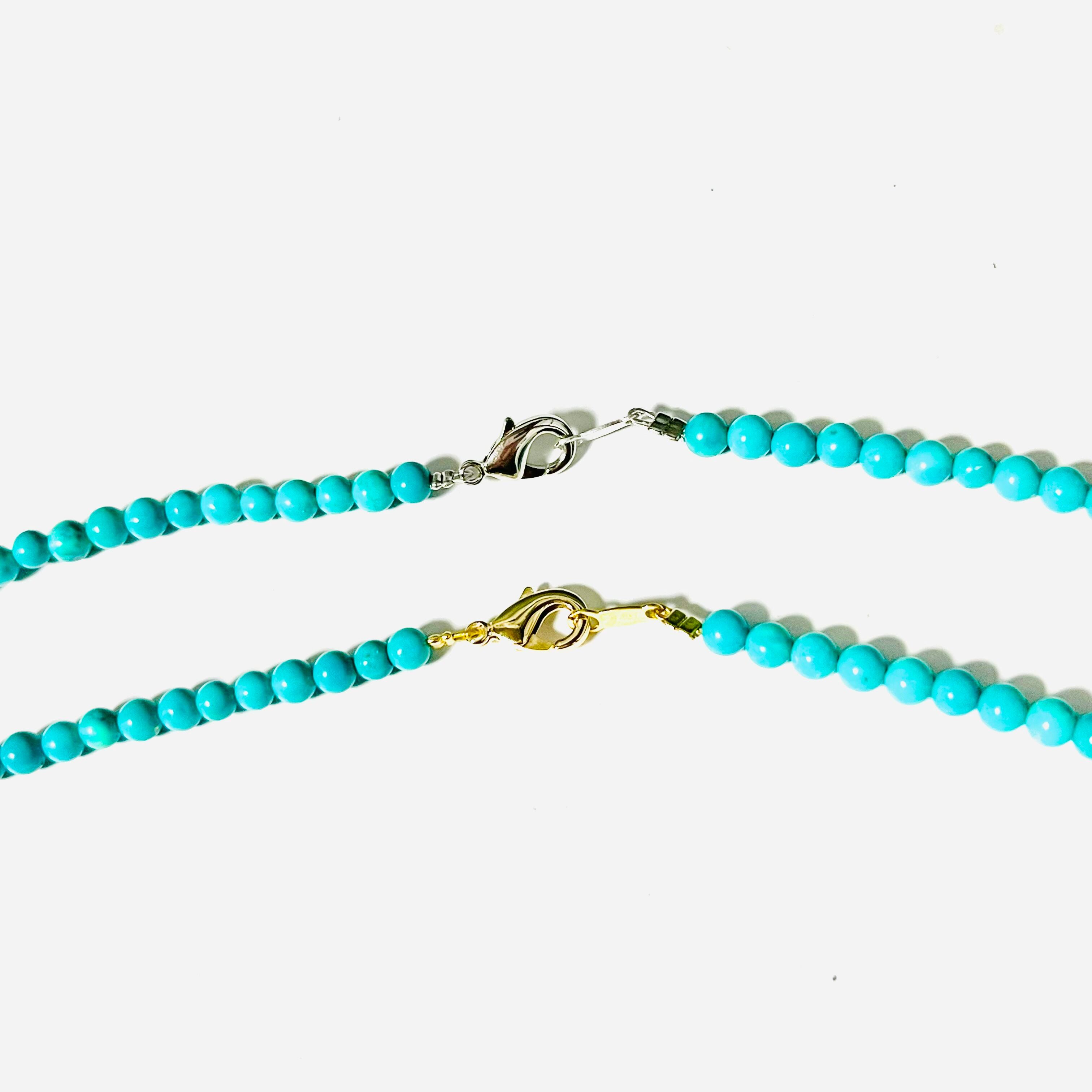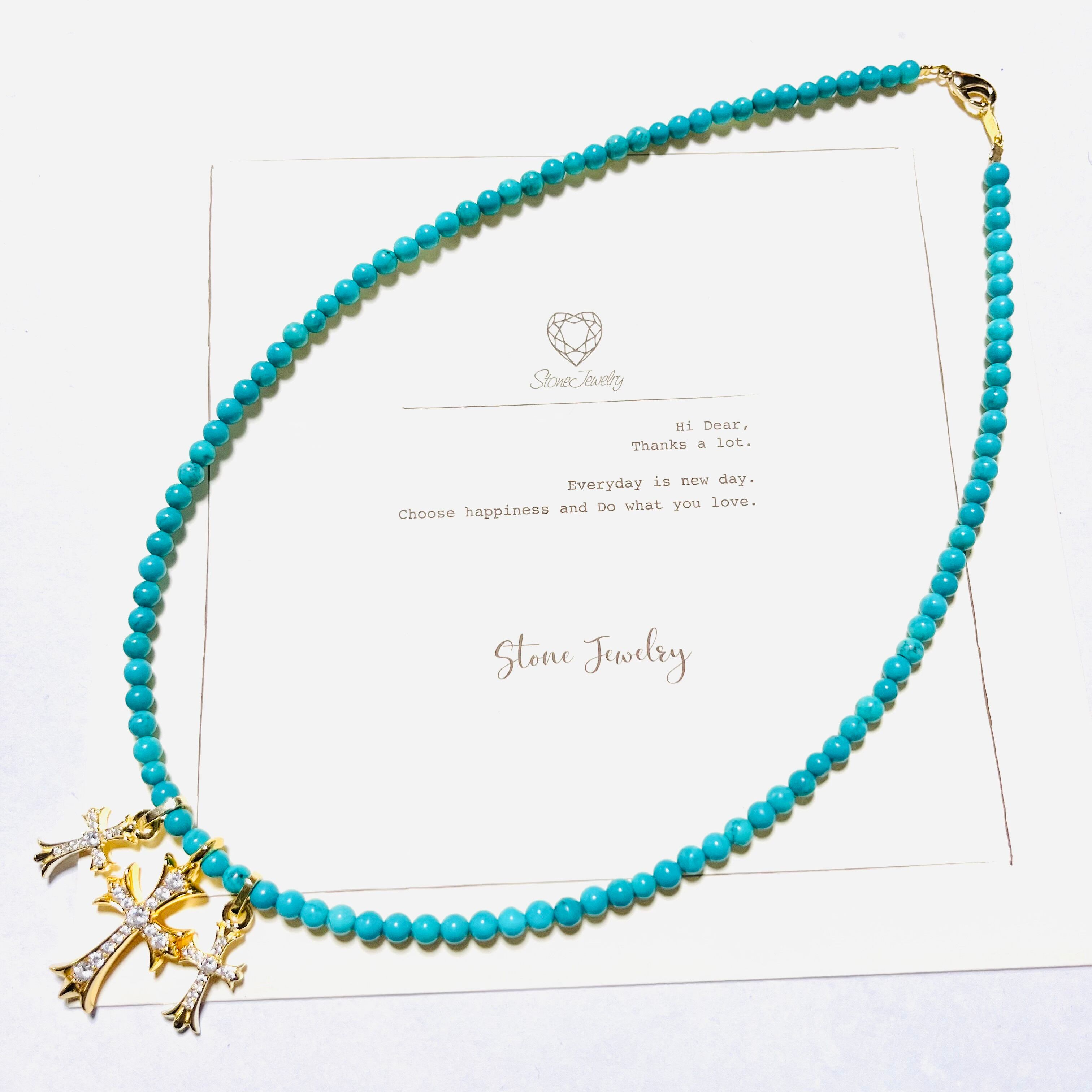 天然ターコイズにsilver925クロスを3連合わせたネックレスでお風呂や海等も着けていただけて長くご愛用できる素材です