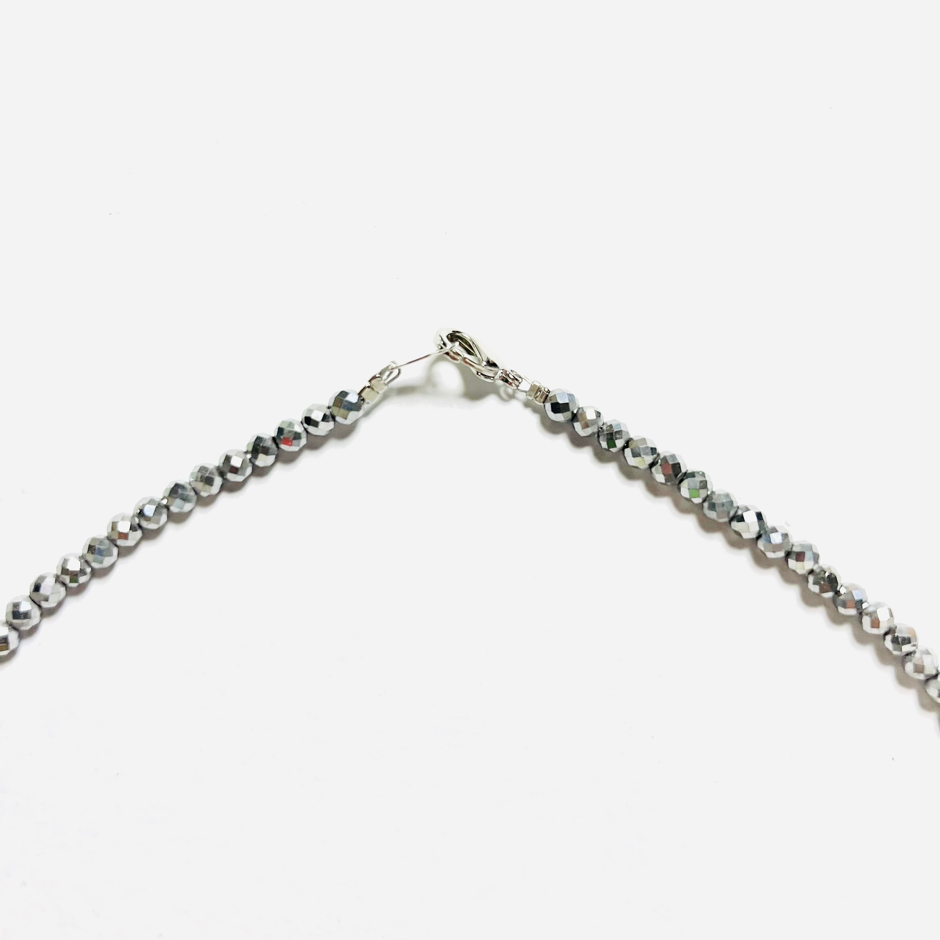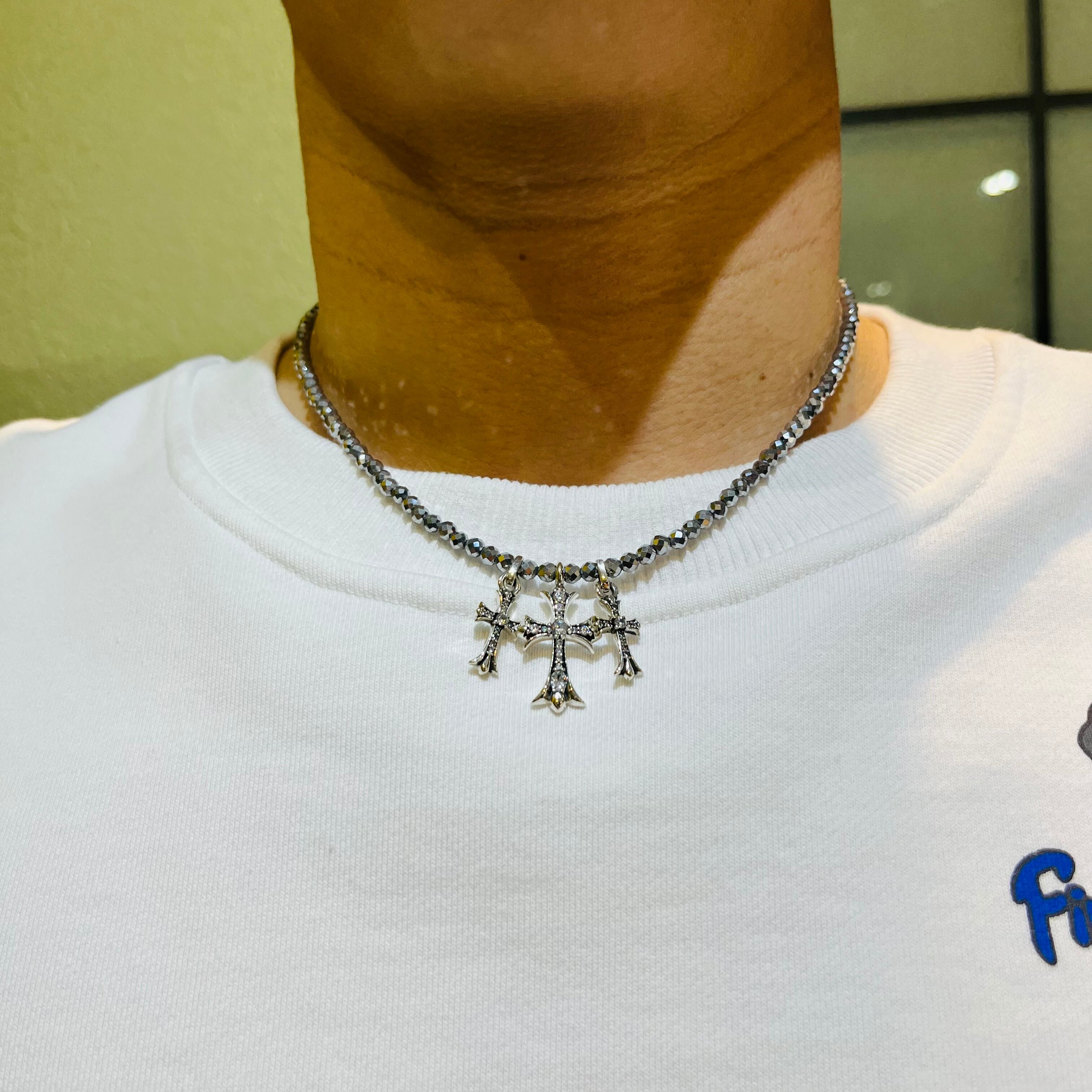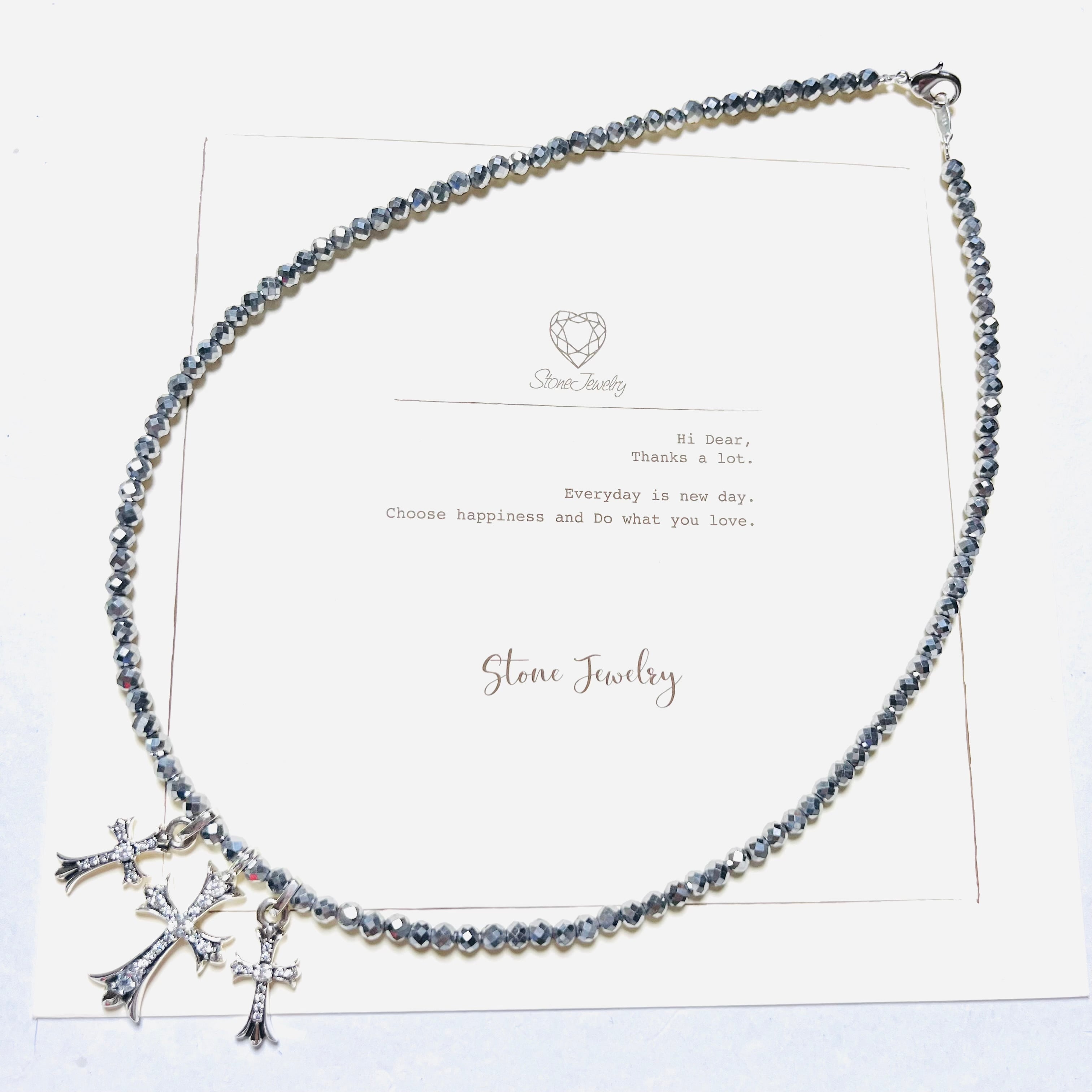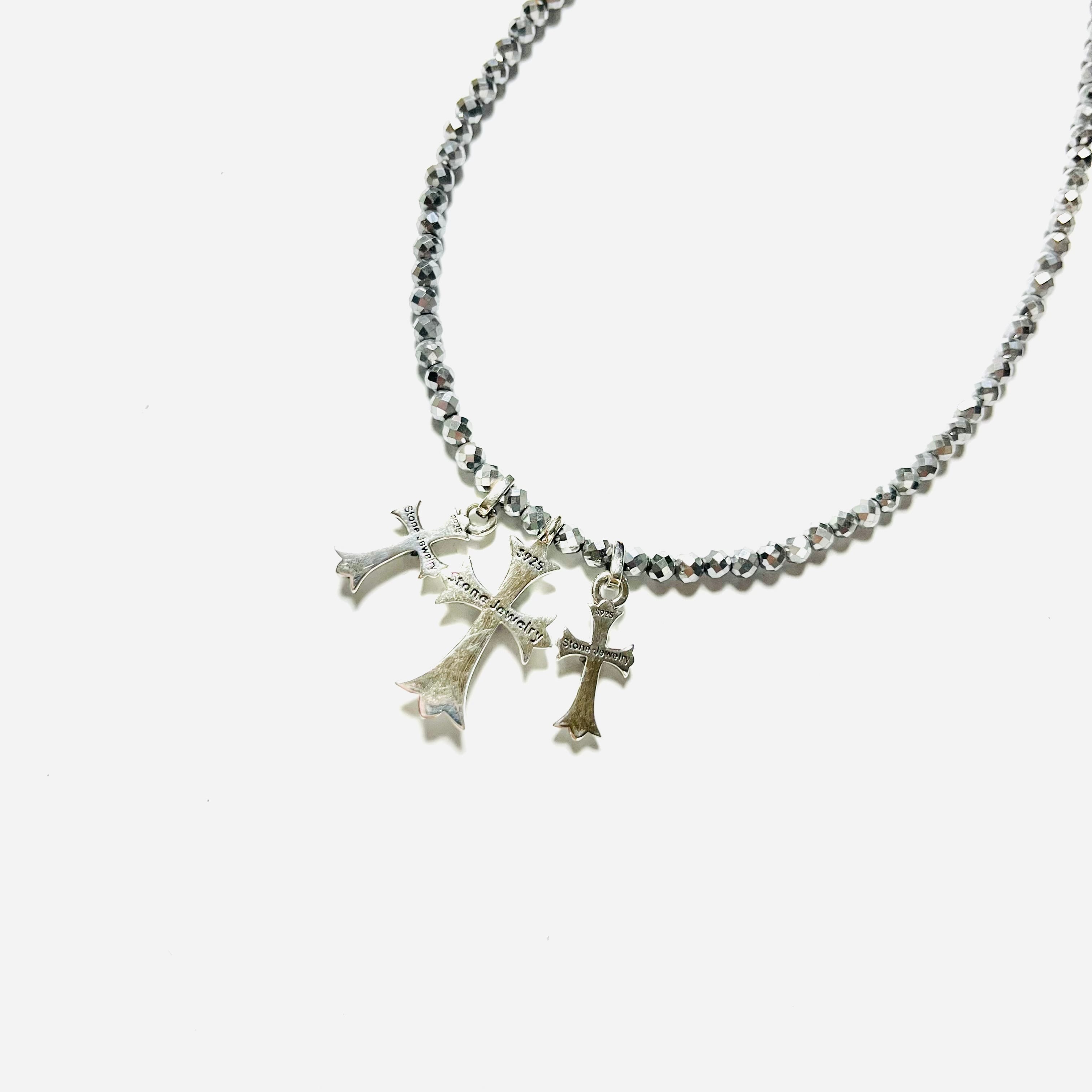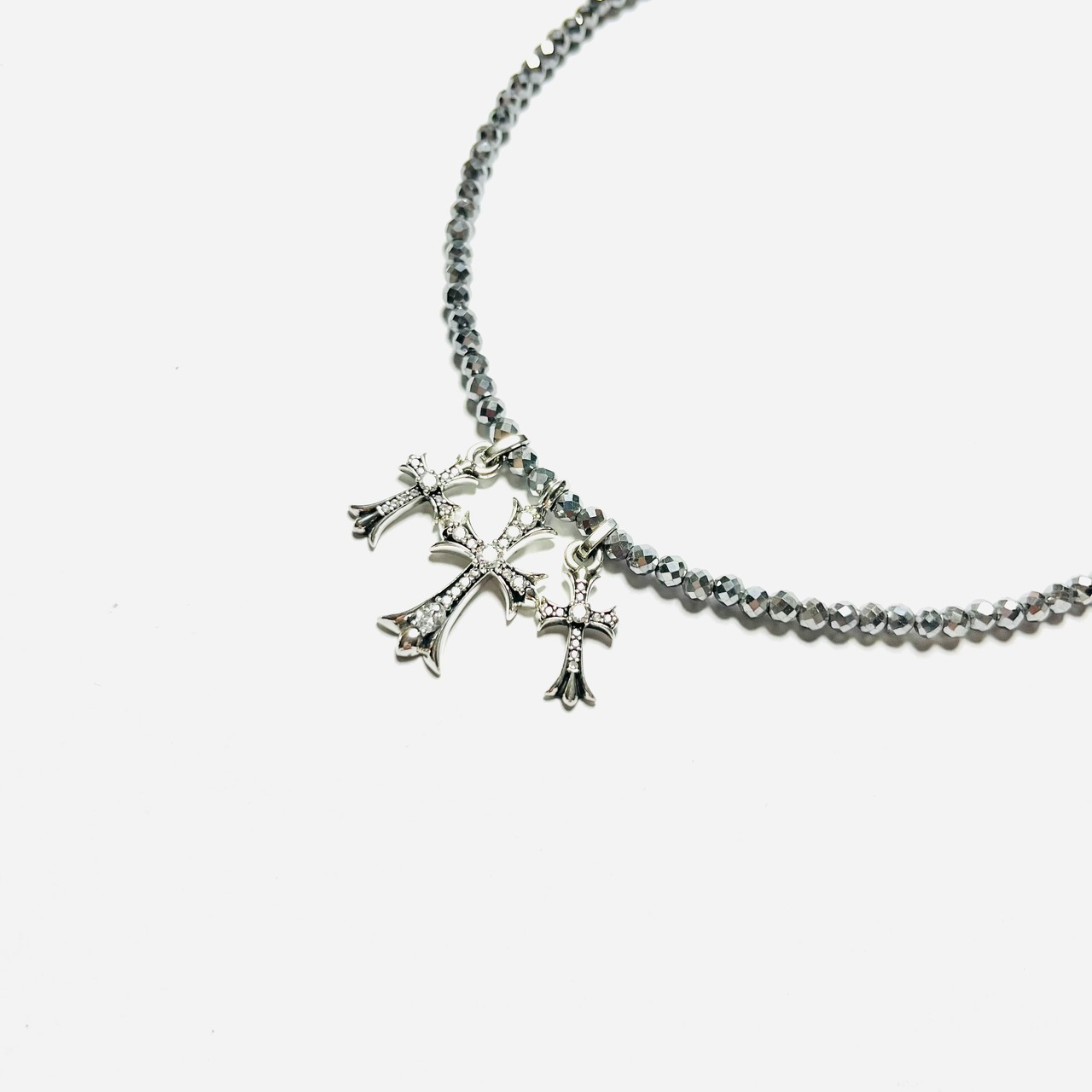 silver925のクロストップを3連で合わせたnecklaceです☆ヘマタイトは鉱石のため劣化する事なく半永久、長くご愛用いただけて肩こり改善、体調バランスを整える健康アイテムとして知られています