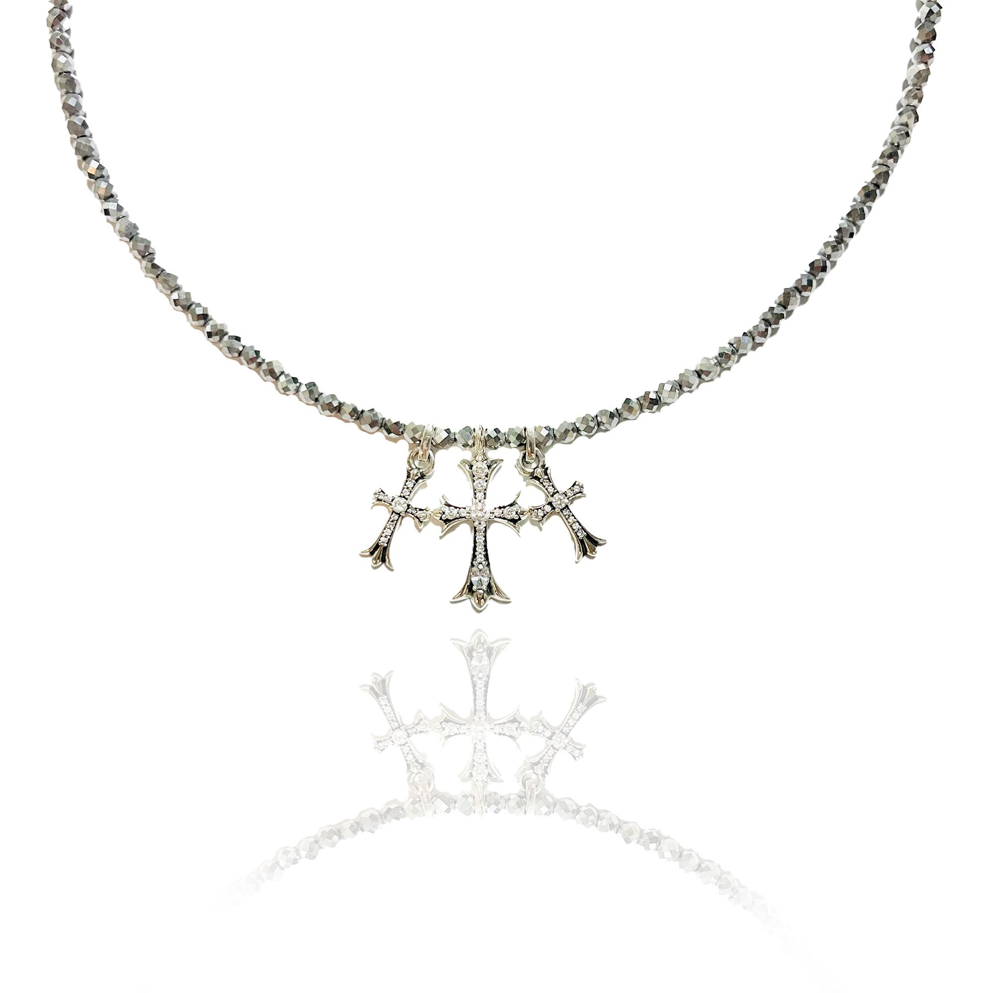 silver925のクロストップを3連で合わせたnecklaceです☆ヘマタイトは鉱石のため劣化する事なく半永久、長くご愛用いただけて肩こり改善、体調バランスを整える健康アイテムとして知られています