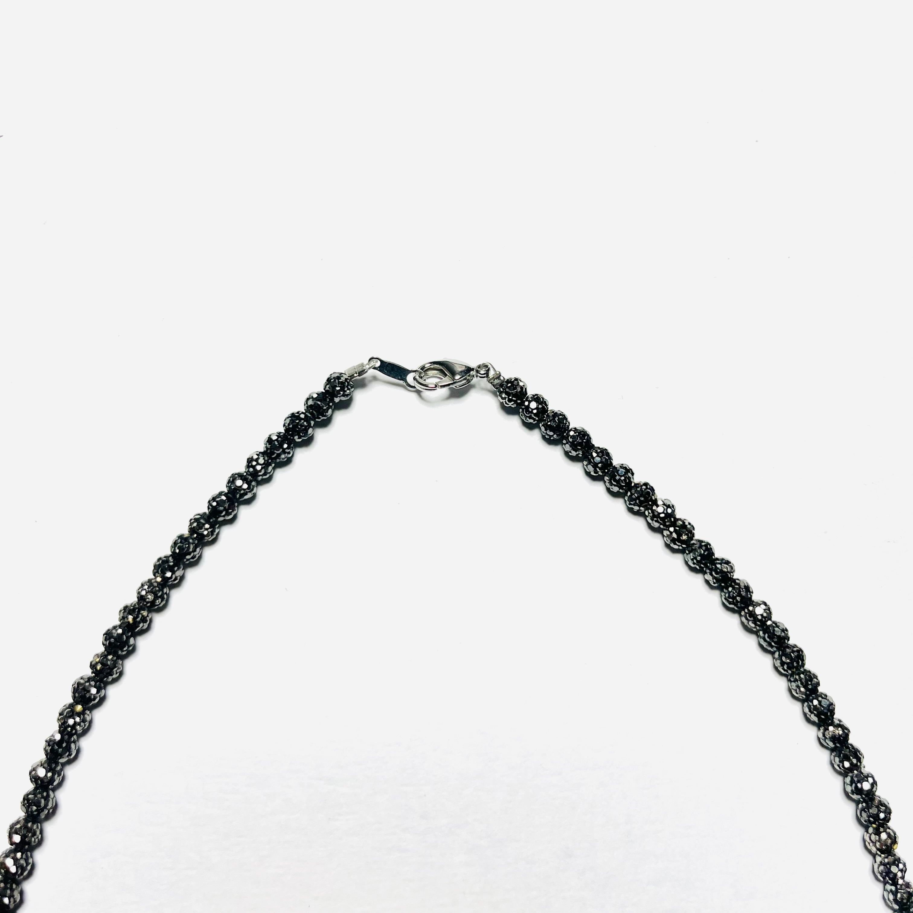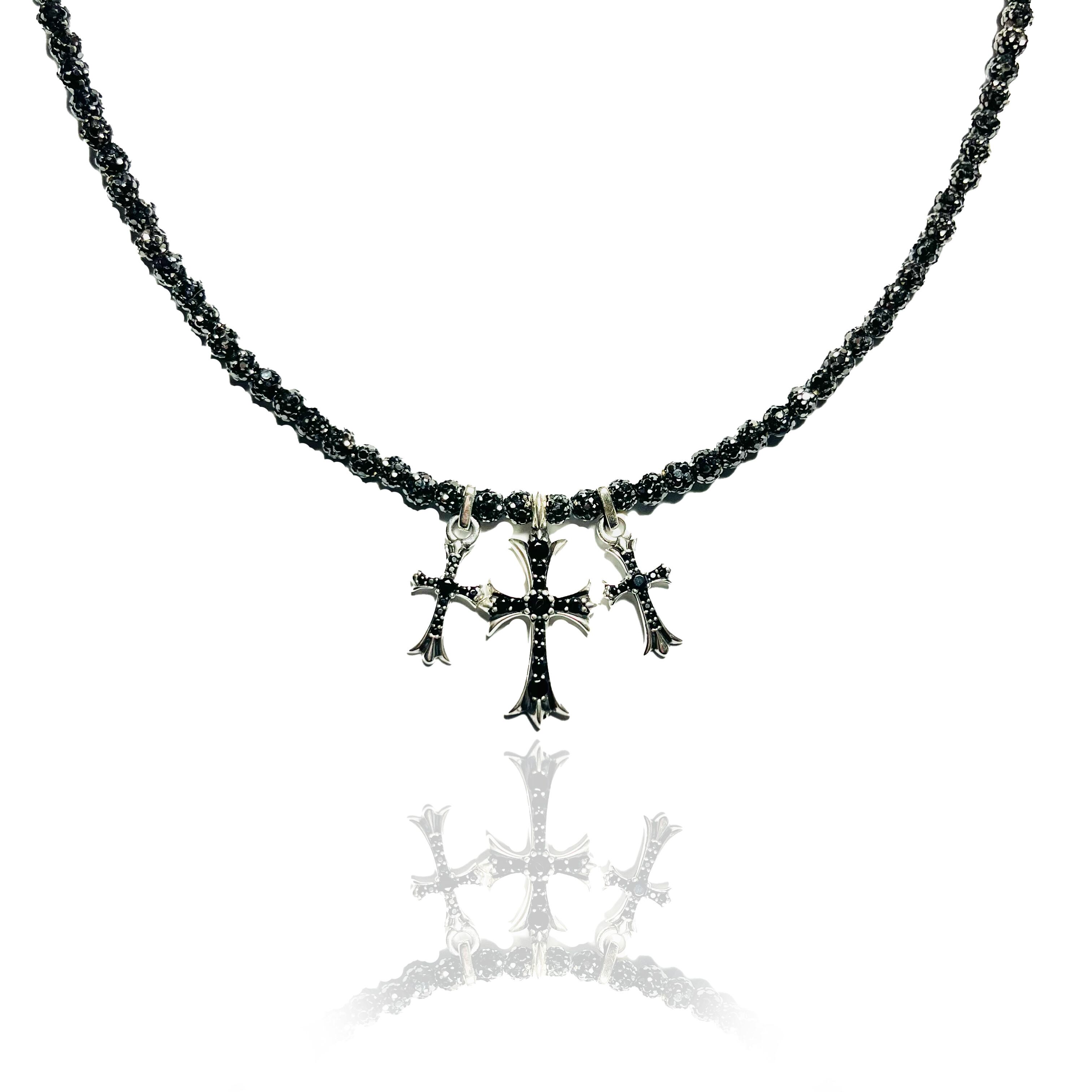 留め具が金属アレルギー対応のサージカルステンレスでsilver925(スターリングシルバー純銀)の3連クロスとキラキラダイヤモンドブラックを合わせたオリジナルネックレスとなります
